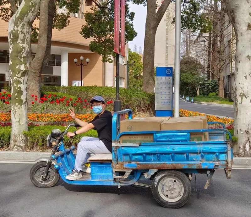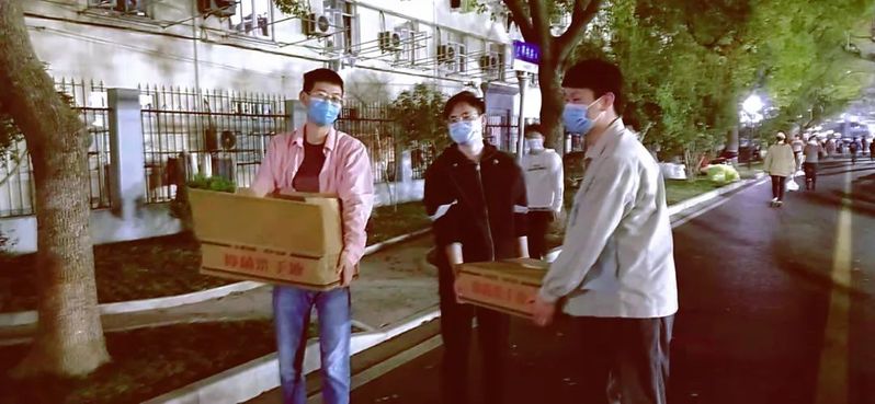 化学学院开展了为健康观察学生送慰问物资的活动。本科生徐汇党支部建立的学生党员先锋队承担主要工作,大家从南门口接收物资,然后运送、分装、打包,将水果、口罩、酒精湿巾、零食发到同学们手中。师生同舟共济,共克时艰。