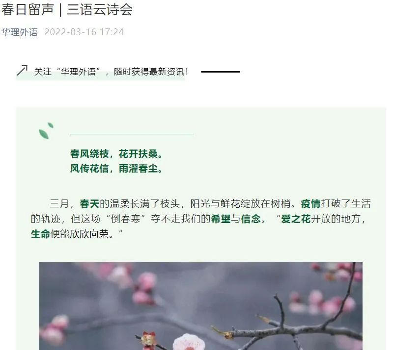外语学院用文体活动引导同学们乐观积极抗“疫”,推送了“外院同学的抗‘疫’生活”专题视频,开展了“春日留声,三语云诗会”“分享抗‘疫’生活小确幸”等特色活动。