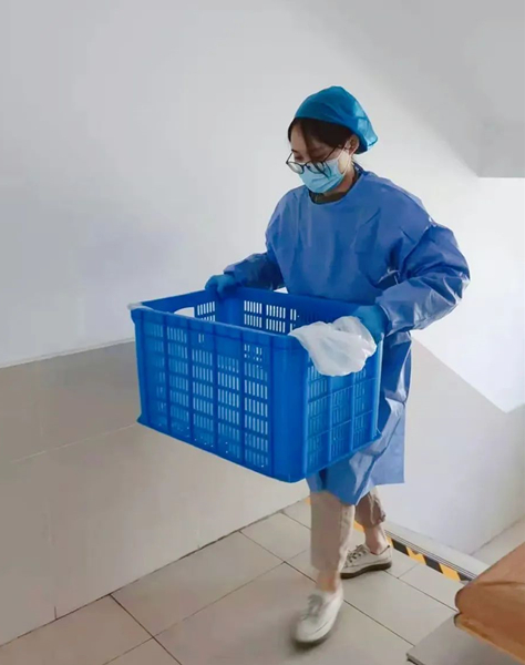 艺术学院宋湉源:每一天从早上七点开始,我就穿上防护衣化身“小蓝”,发放三餐、引导核酸检测。从一开始手忙脚乱到现在流程逐渐熟稔于心,我与大家的配合也变得越来越默契。我认为,层长这份职责带给我的温暖更甚。虽然身在宿舍,学院老师时刻通过线上关注守护着同学们。同学一旦有需求,便不辞辛劳地奔波,送来急需的生活用品、寻找药品、布置考研复试的环境,如同父母为大家操劳。同学们积极配合,每间宿舍门口标记用餐人数的纸条上,一张张都写着“谢谢”“辛苦了”……让“小蓝”们感动。