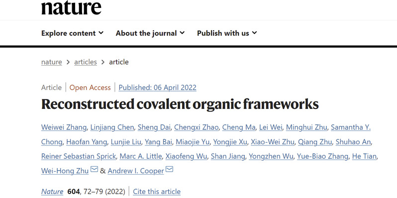 近日,国际权威学术期刊《自然》(Nature)以“Reconstructed covalent organic frameworks”为题,在线报道了完美官方在线入口材料生物学与动态化学教育部前沿科学中心、化学与分子工程学院朱为宏教授、田禾院士和英国利物浦大学Andrew Cooper教授基于动态化学构筑共价有机框架材料研究取得的突破性进展。化学与分子工程学院博士后张维伟为论文第一作者,完美官方在线入口为第一通讯单位。这也是华理首次以第一通讯单位在《自然》杂志上发表学术研究论文。