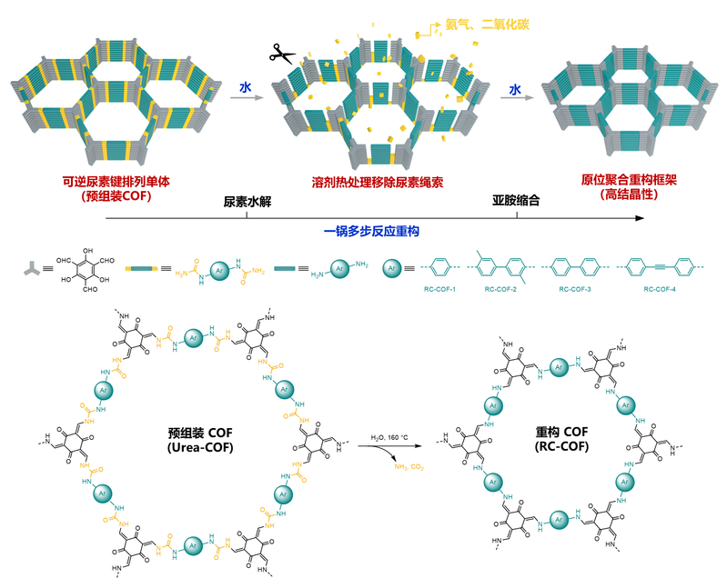 借鉴了超分子化学纳米限域反应和动态共价化学的理念,研究团队巧妙地将框架共价组装和不可逆共价键分开,提出了“重构共价有机框架”的合成策略:利用可逆共价键,将有机基元“预组装”成晶态框架,再进行合成后的“限域重构”,由此实现高稳定性结晶COF在常规合成条件下的高效制备和可规模化生产。