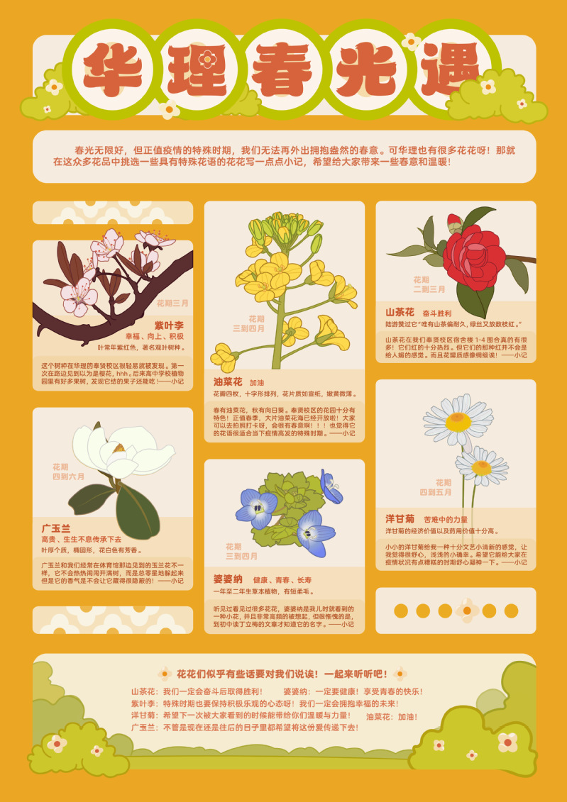 山茶花:“我们一定会取得最后的胜利!”;紫叶李:“我们一定会拥抱幸福的未来!”;洋甘菊:“希望能带给你们温暖与力量!”;广玉兰:“希望将这份爱传递下去!”;油菜花:“加油!”。艺术学院2020级本科生吴怡巧解花语送祝福,借助校园里的花来坚定疫情防控阻击战一定会取得胜利的信念,她还制作了精美的“华理春光遇”海报,希望能给身边的人带来春意和温暖。