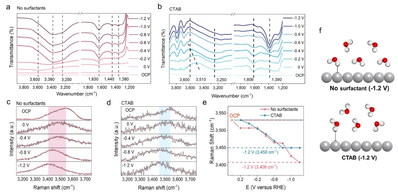 针对CO2和水共同参与的电催化还原过程,该工作创新性地采用了具有不同烷基链长度的季铵盐阳离子表面活性剂作为电解液添加剂,利用原位红外和拉曼光谱结合分子动力学模拟,研究了表面活性剂在电催化剂表界面的动态组装行为,以及CO2和水在界面微环境的动态分布和反应活性。发现随着偏置电位的增加,季铵盐阳离子表面活性剂在界面微环境中由无序排列转变为有序组装。表面活性剂动态形成的有序组装结构可以形成更紧密的双电层结构,促进界面微环境中的传荷和传质;另外发现烷基链长度越长,界面电容值越高,越有利于界面微环境中的荷质传递。通过原位红外和拉曼光谱表征,发现长链表面活性剂形成的有序结构通过排斥界面处的isolated water调节界面水的氢键环境、降低界面水的解离活性,并促进CO2在界面微环境中的富集,从而提高了CO2电还原制CO的选择性和偏电流密度。进一步利用分子动力学模拟,阐明了界面微环境中分子尺度的物质分布特征及其在外加电场下的演变规律,验证了原位实验光谱中观察到的表面活性剂的构象演变过程,发现长链表面活性剂形成的有序组装结构构建了亲气-憎水的通道,从而提高了气体的传质通量和反应选择性,抑制了电解水析氢的活性。该工作对界面微环境的认识可以推广到其他与水有关的电化学反应中,如水溶液中的氮气还原、氧气还原以及有机分子电还原。