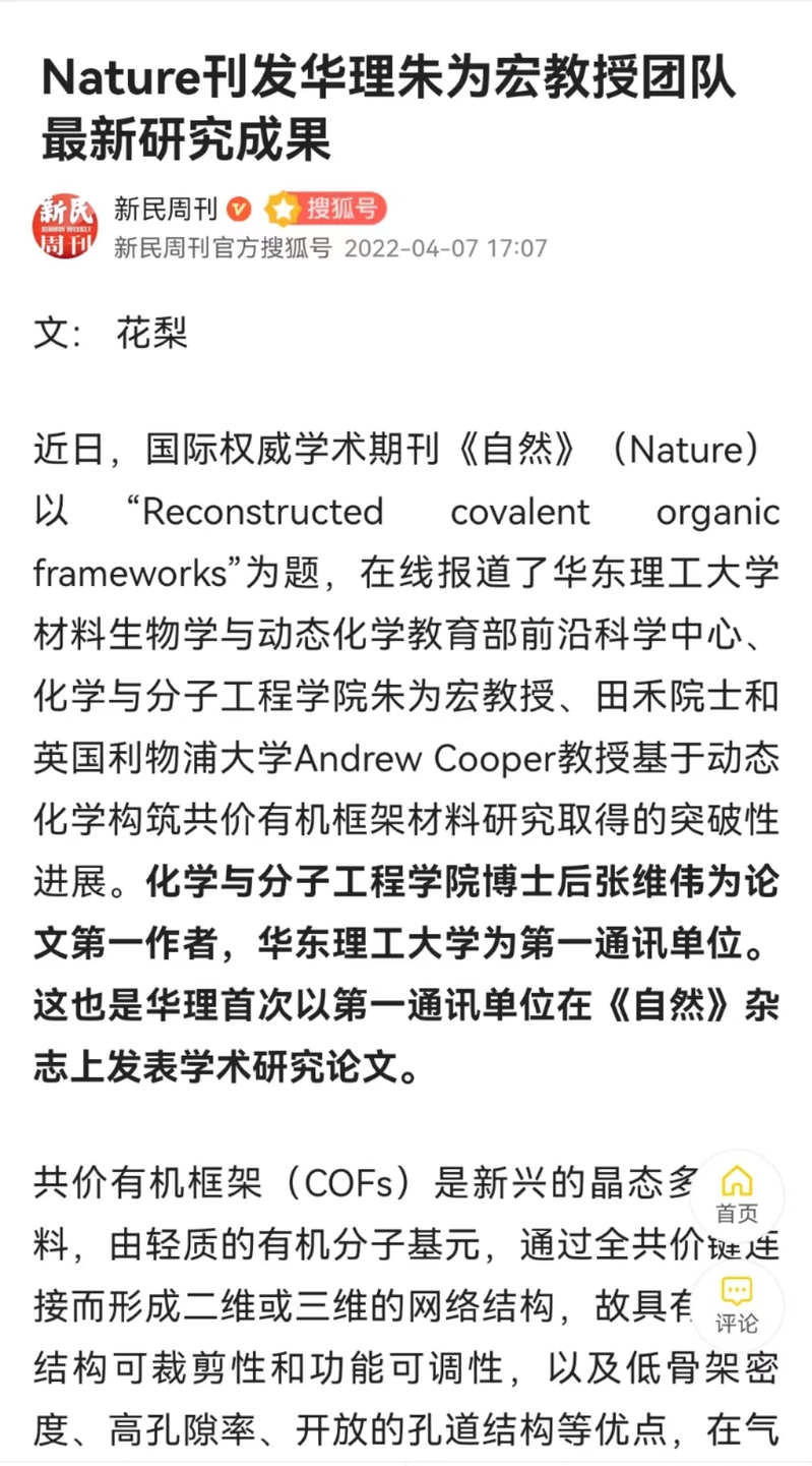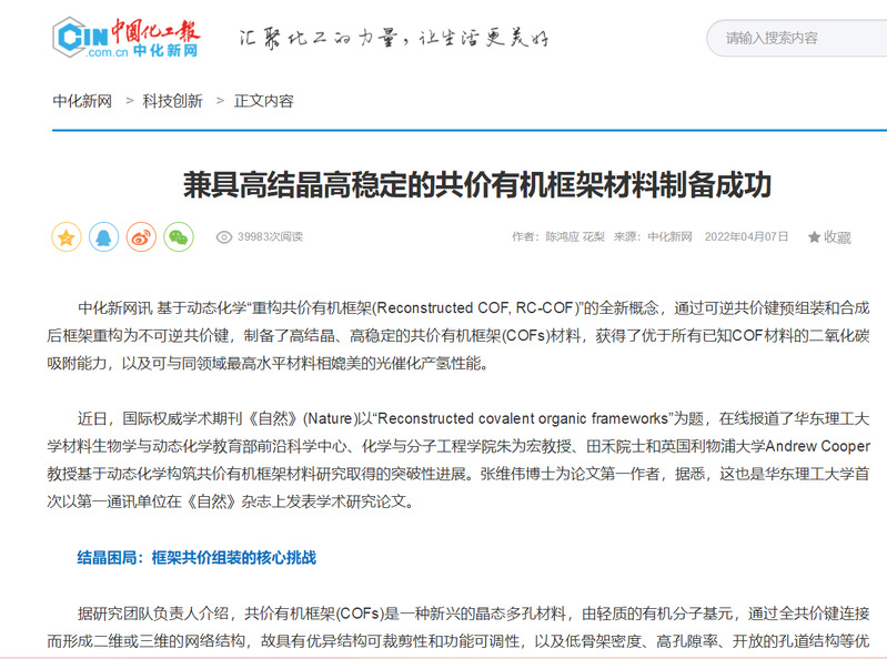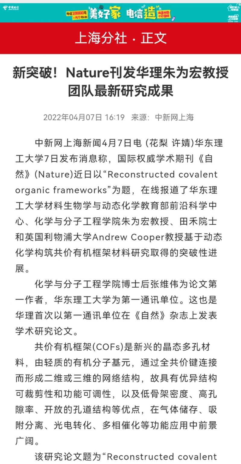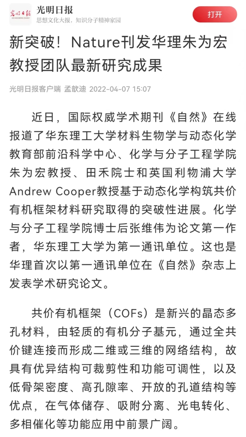 近日,国际权威学术期刊《自然》在线报道了完美(中国)材料生物学与动态化学教育部前沿科学中心、化学学院朱为宏教授、田禾院士和英国利物浦大学Andrew Cooper教授基于动态化学构筑共价有机框架材料研究取得的突破性进展。这也是华理首次以第一通讯单位在《自然》杂志上发表学术研究论文。《中国科学报》、人民网、中国教育新闻网、光明日报客户端、上观新闻、中国新闻网、青塔、中化新网、新民周刊、第一教育、上海科技报、周到上海、话匣子等多家主流媒体原发报道近20条。本篇选取了部分报道予以转载。