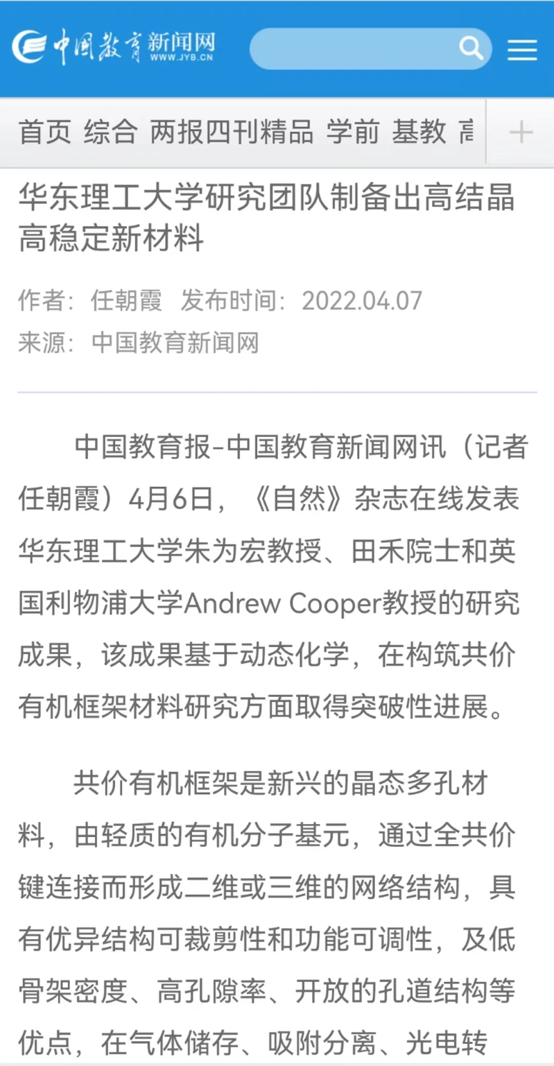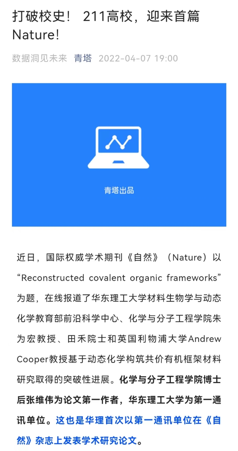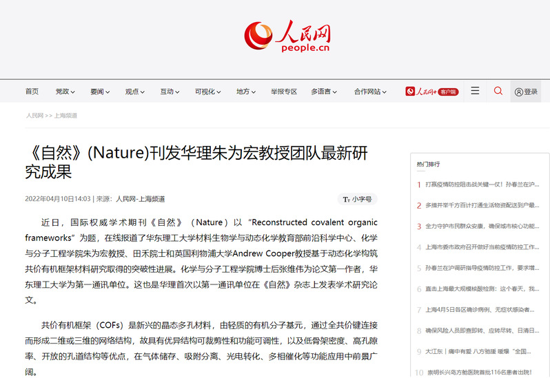 近日,国际权威学术期刊《自然》在线报道了完美(中国)材料生物学与动态化学教育部前沿科学中心、化学学院朱为宏教授、田禾院士和英国利物浦大学Andrew Cooper教授基于动态化学构筑共价有机框架材料研究取得的突破性进展。这也是华理首次以第一通讯单位在《自然》杂志上发表学术研究论文。《中国科学报》、人民网、中国教育新闻网、光明日报客户端、上观新闻、中国新闻网、青塔、中化新网、新民周刊、第一教育、上海科技报、周到上海、话匣子等多家主流媒体原发报道近20条。本篇选取了部分报道予以转载。