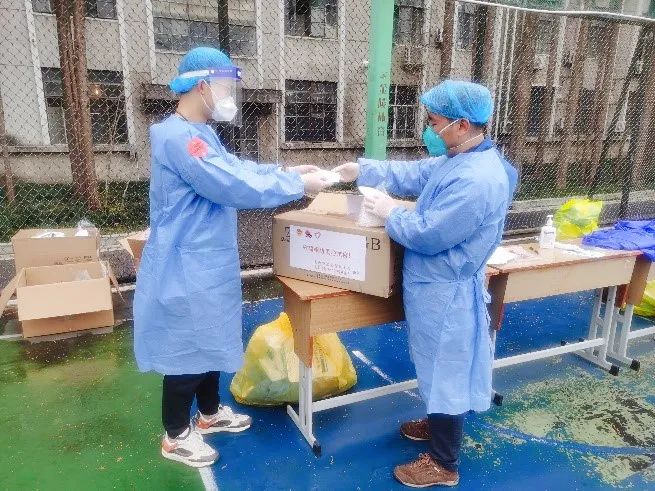 农夫山泉公司捐赠500份加热即食的浇头饭,发放给学校志愿者。