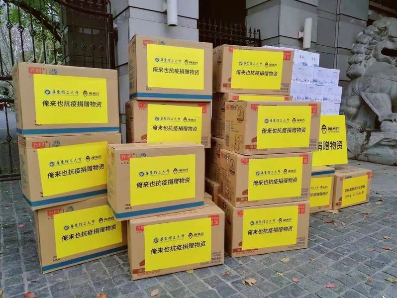 在化工学院1997级校友刘汉伟的协调下,上海教育超市携手供应链企业,助力华理防疫工作,捐赠了一批价值10万余元的物资,包括150余盒坚果、近400盒核桃、60箱可乐、1100余箱矿泉水、600盒口罩。