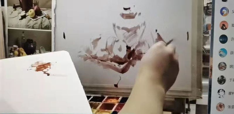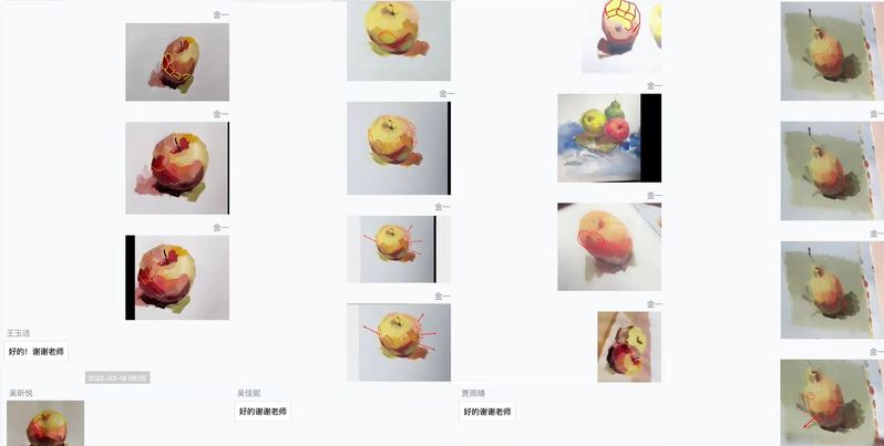 而在屏幕的另外一边,40多名零基础的大一学生正在安静地学习作画。“色彩的捕捉训练实践性很强,如何通过线上的方式让学生易看、易懂、易练、易会是保证课程质量的关键。”从纯手工活转向“手工+直播”,金一摸索出了自己的一套方法:课前,收集大量素材,结合学生容易出错的细节精心绘制步骤图;课上,再分步示范,让学生跟随作画步骤演练,并鼓励大家线上提问及时互动,通过摄像头查看每一位学生的进展;课后,对学生提交的作品通过文字、图片、语音等形式进行系统点评,给出建议。
