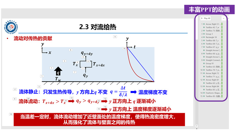 在线学习时,学生的视野大多只能集中在电脑屏幕上,很容易疲劳,注意力也容易分散。适当地给幻灯片添加一些动画,既有利于抓住学生的注意力,也有利于让学生掌握知识推导的逻辑顺序。因此,赵方的每一张幻灯片至少有两个动画,内容比较丰富的幻灯片,可能包含十几个动画。