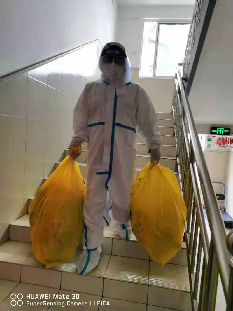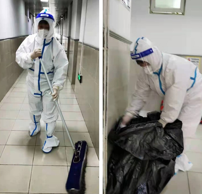 每天凌晨5:30,她便开始为每层楼的公共区域开窗通风、扫地拖地,学生放在门口的一日三餐的厨余垃圾,她从五楼开始一层层往下收,虽然垃圾很重、穿着防护衣很热,可她从不叫苦,对她而言,给同学们创造良好生活环境、及时清洁楼道是她要尽心尽力做好的事情,也是她主动要求进入宿舍楼的初衷。