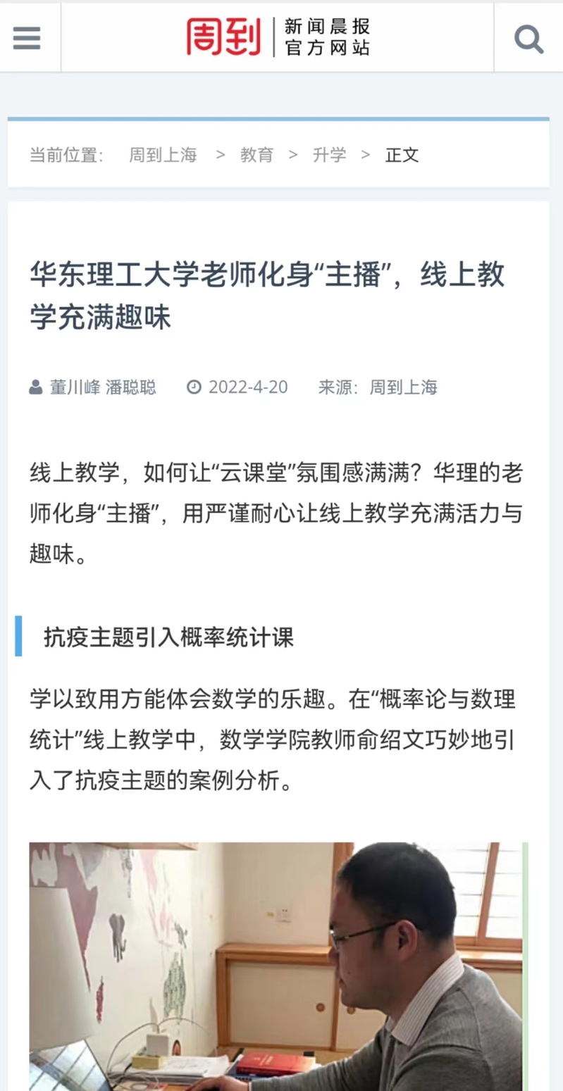 学以致用方能体会数学的乐趣。在“概率论与数理统计”线上教学中,数学学院教师俞绍文巧妙地引入了抗疫主题的案例分析。