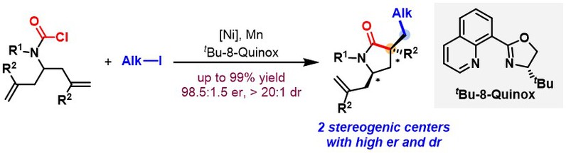 去对称化反应是指含有前手性中心或内消旋化合物在其中一个反应位点选择性官能团化的同时,实现对映面识别的过程,是一类合成手性小分子的重要策略。陈宜峰课题组利用性质稳定且易于制备的胺甲酰氯取代的1,6-二烯为原料,通过镍催化还原偶联策略,使用在不对称催化反应中应用较少的手性8-喹啉噁唑啉为配体,实现了非活化的1,6-二烯的去对称化不对称胺甲酰基-烷基化反应,为含多手性中心的γ-内酰胺的便捷式合成提供了一类全新、温和高效的方法。该成果近期发表于Angew. Chem. Int.Ed. (DOI: 10.1002/anie.202111598) 。