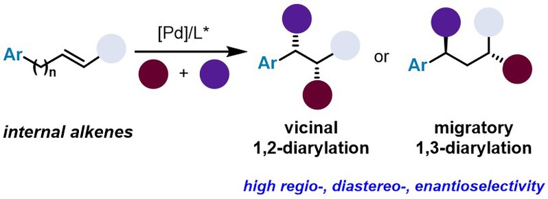 简单的非环状内烯烃参与的分子间多组分双碳官能团化反应来构建多个手性中心在有机合成中仍然是巨大的挑战。陈宜峰课题组利用两类简便易得的非环状内烯(肉桂基氨基甲酸酯和烯酰胺两种烯烃)为起始原料,实现了钯催化内烯的不对称Heck型1,n-双芳基化反应。该反应能够以专一的区域选择性和非对映选择性以及高对映选择性分别实现含有两个连续手性中心的三芳基丙醇、三芳基乙胺类衍生物的模块化合成。此外,他们还实现了苄基取代烯酰胺的1,3-迁移对映选择性双芳基化反应,手性钯中间体经过立体专一性的链行走过程,在烯酰胺的C-1和C-3位同时引入两个不同的芳基,实现一系列手性三芳基丙胺类衍生物的合成。该成果近期发表于J. Am. Chem. Soc. (DOI:10.1021/jacs.2c03411)。