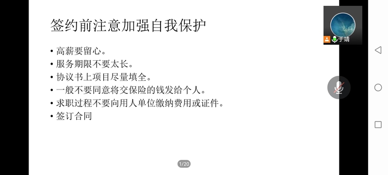 “在疫情防控时期开设就业讲座,更要精益求精、常讲常新,哪怕是一个新的细节问题也要讲清楚,因为对学生来说也许就是一个机会!”从不同年级学生的实际需求出发,于靖多次组织线上就业咨询会,开设“就业直通车”系列讲座,把同学们关注的问题和困难集中起来答疑释惑,分析当前就业形势以及岗位需求,分享简历制作和应对面试的技巧,引导毕业班同学树立“先就业再择业”的观念,拓宽就业思路,鼓励非毕业班同学做到心中有数、未雨绸缪。