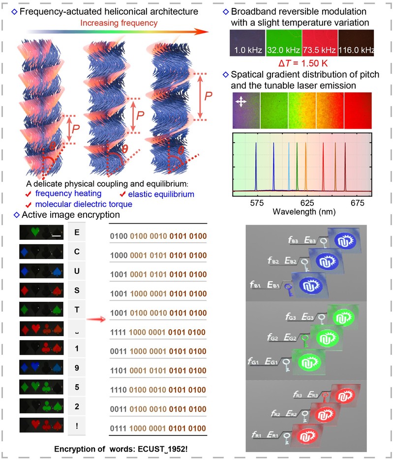 信号频率驱动光学微结构对当代先进光子学和光学工程的发展有着重要意义。利用软物质体系的频率响应特性可实现宽动态范围的螺旋结构调制,然而,这种调控机制的突出问题是高频热效应给器件实际应用带来的严峻挑战。胆甾相液晶是一类具备自组装螺旋微结构的光学软材料,具有出色的刺激响应特性。对于某些特定的胆甾相液晶体系,可以通过调节所施加电场的频率,来实现相态的切换及螺旋结构螺距调制,例如在离子型液晶体系中,增大电场频率,可以形成均匀排列的平面织构,从而降低电场频率,转变为光散射态;在双频液晶中,调节电场频率可实现对直角螺旋结构的螺距及光谱的调制。然而,实现光谱宽动态范围调制通常需要兆赫兹级的高频电场,这种高频信号驱动通常将导致严重的介电加热现象,甚至会使样品温度急剧升高,在实际应用中不可避免地会加速设备和系统的老化。