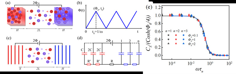 针对上述问题,作者团队在平行板堆叠电极结构模型上使用等效电路模型和Poisson-Nernst-Planck方程,分别研究了多孔电极宏观动力学和纳微观尺度的电解液热力学与动力学。研究发现,由外加电压扫描频率ω和堆叠电极模型的弛豫时间τn组成的无量纲组合ωτn为CV曲线和表面积分电容Cs的决定参数:当ωτn<<1时,CV曲线由双电层限制,而当ωτn>>1时,CV曲线由扩散限制,其中弛豫时间τn的表达式为: