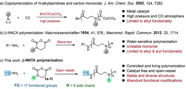 天然多肽具有重要生物学功能,但结构不稳定和易被蛋白酶水解等缺点限制多肽的功能和应用。多肽模拟物可以针对性地应对这一挑战,因而在药物发现、组织工程等诸多领域具有重要应用。前期,刘润辉教授课题组建立了对水分不敏感的β-NTA(β-氨基酸N-硫代羧基酸酐)聚合新方法,解决了β-内酰胺聚合制备β多肽这一经典合成方法对水分敏感、聚合条件苛刻、功能基团受限的核心挑战(Angew.Chem. Int. Ed. 2020, 59, 7240-7244)。