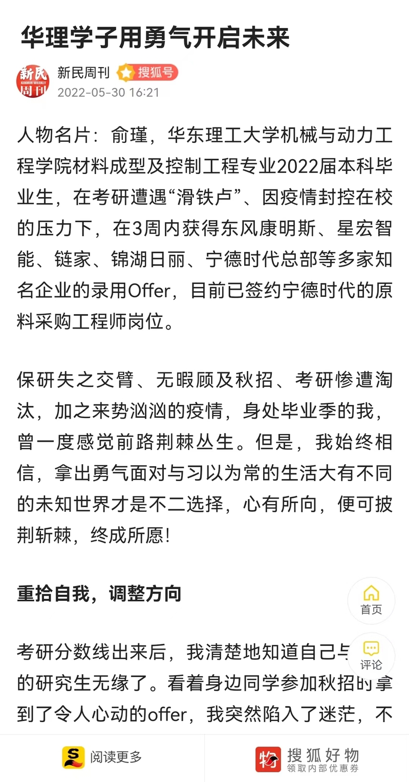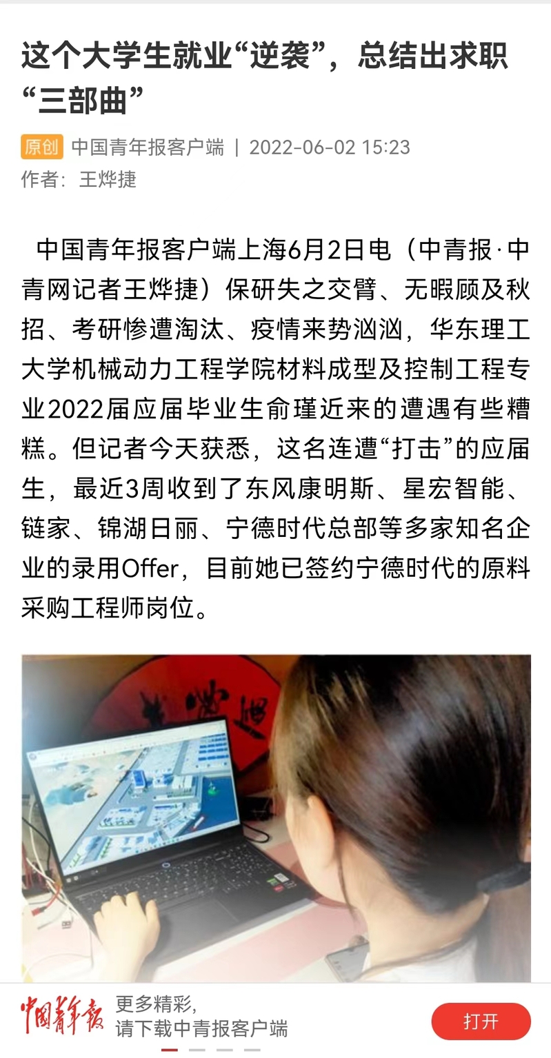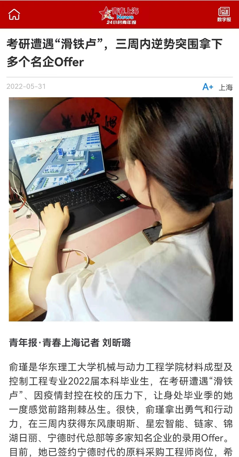 疫情期间,机动学院2022届本科毕业生俞瑾在考研遭遇“滑铁卢”、学校实行闭环管理的压力下,直面困境,通过努力3周内获得东风康明斯、星宏智能、链家、锦湖日丽等多家企业的录用,现已签约宁德时代原料采购工程师岗位。中国青年报客户端、上观新闻、新民周刊、青春上海、东方网、周到上海、第一教育、上海科技报等近10家媒体进行了原发报道,本篇选取了部分报道予以转载。