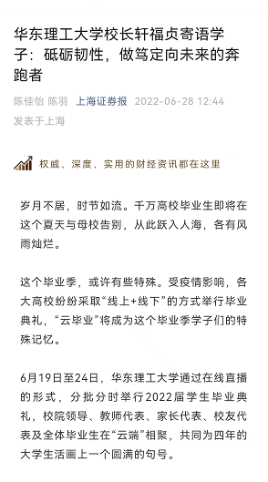 【上海证券报】完美官方在线入口校长轩福贞寄语学子:砥砺韧性,做笃定向未来的奔跑者