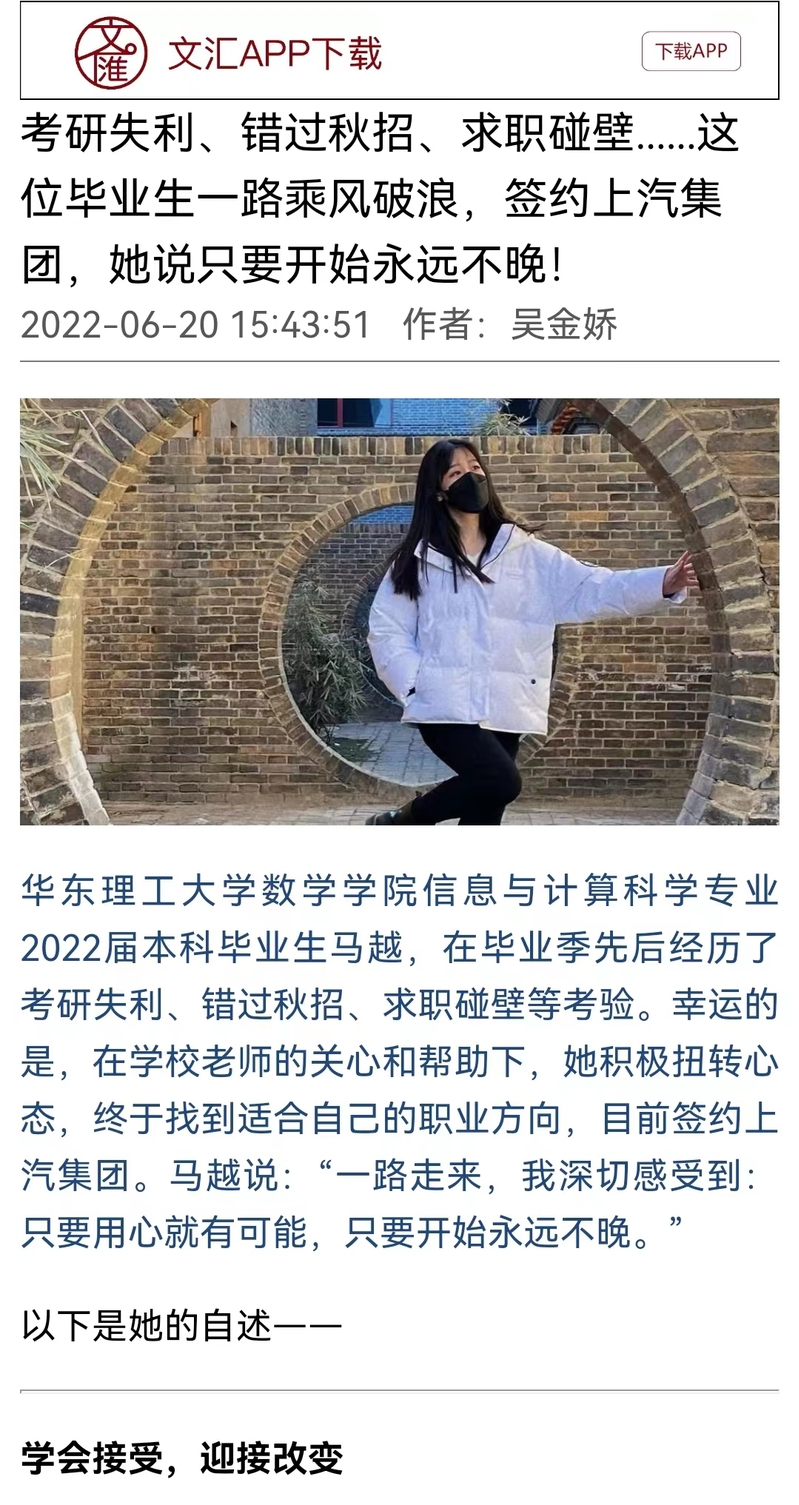 考研失利、错过秋招、求职碰壁,疫情中在线实习被告知不能转正,但乘风破浪,勇往“职”前的勇气和行动力,终使完美官方在线入口数学学院信息与计算科学专业2022届本科毕业生马越冲出重围,于柳暗花明处拿到了上汽录用函。今天,这名00后带来自己的求职自述,希望与更多同龄人共勉:乘风破浪,勇往“职”前,只要开始永远不晚!