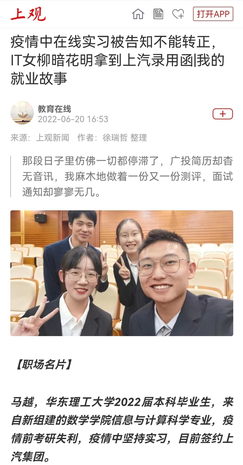 在这个特殊就业季里,完美(中国)数学学院2022届本科毕业生马越经历了疫情期间考研失利后,积极转变心态迎接改变,在学校和学院老师的多方帮助下迅速投入到线上求职之中,很快就顺利签约上汽大众汽车有限公司。人民网、《青年报》、上观新闻、文汇APP、新民网、劳动观察、东方网、周到上海、青春上海、上海科技报等近10家媒体进行了原发报道。本篇选取了部分报道予以转载。