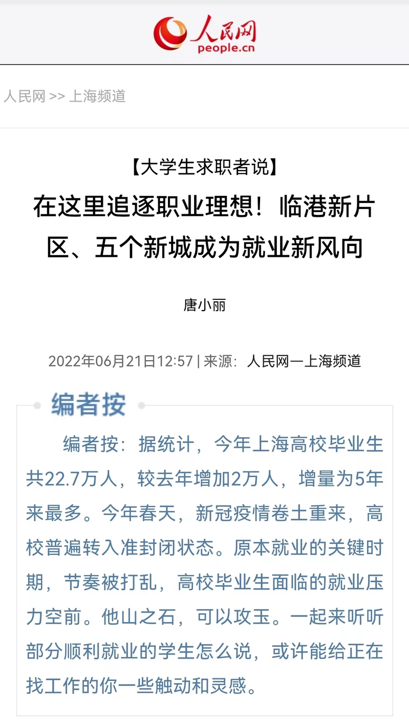 【人民网】在这里追逐职业理想!临港新片区、五个新城成为就业新风向(节选)