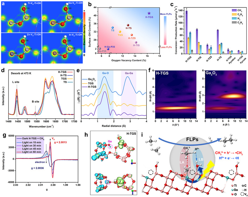 在此,通过DFT计算设计了由TiO2中掺杂低价金属离子作LA和相邻Ti-OH作为LB组成的长距离(0.31-0.37 nm)FLP。并通过实际的掺杂和加氢处理制备得到了具有大孔-介孔结构的金属掺杂TiO2-SiO2。由于LA-LB的长距离和酸碱强度匹配,氢化Ga掺杂的复合材料实现了优异的C-H键拉伸,CH4转化速率高达139 μmol g-1 h-1,产物乙烷选择性达88%。根据TD-DFT计算和原位EPR分析,光辐照导致电子从Ga激发到Ti-OH,从而促进了·CH3的形成和耦合。这项工作为设计和构建具备光催化活性的 FLP 用于甲烷 Csp3-H 极化提供了深入的见解。同时有望积极推动 FLP 体系在温和条件下烷烃选择性转化中的应用。