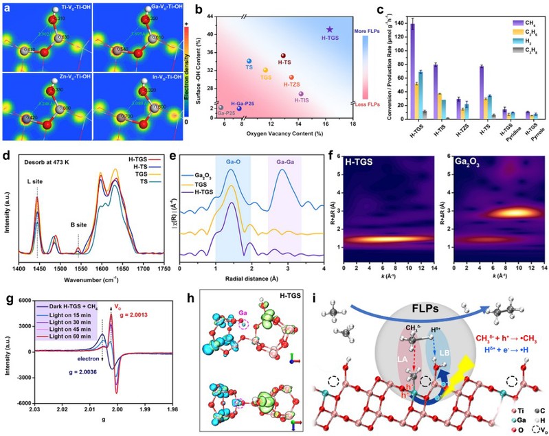 该研究以锐钛矿TiO2为模型,首先利用DFT计算证明以低价金属离子(M = Ga3+、In3+、Zn2+)取代TiO2 (101)面六配位Ti6c作为路易斯酸(LA)、以相邻五配位Ti5c-OH作为路易斯碱(LB)可形成被氧空位(Vo)阻隔的长距离(0.31-0.37 nm)的FLP位点(M-Vo-Ti5c-OH),甲烷通过CH3-LA-LB-H的方式活化。根据理论计算结果,作者利用课题组已有在多孔半导体甲烷光催化转化的工作基础(J. Am. Chem. Soc. 2019, 141, 6592–6600; Angew. Chem. Intern. Ed., 2021, 60,11901–11909;ACS Catal. 2021, 11, 3352–3360),结合金属离子掺杂和氢化处理制备得到了具有多级孔结构的Ti基FLP。相比其它掺杂金属离子,由于LA-LB的长距离和酸碱强度匹配,氢化Ga掺杂的复合材料表现出最高的CH4转化速率(139 μmol g-1 h-1)。根据TD-DFT计算和原位EPR分析,光辐照导致电子从LA激发到LB,从而促进·CH3的形成和C-C耦联。这项工作为设计和构建具备光催化活性的 FLP 用于甲烷 Csp3-H 极化活化提供了指导,有望积极推动 FLP 体系在温和条件下烷烃选择性转化中的应用。