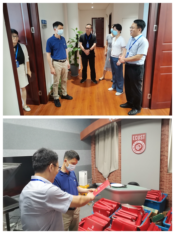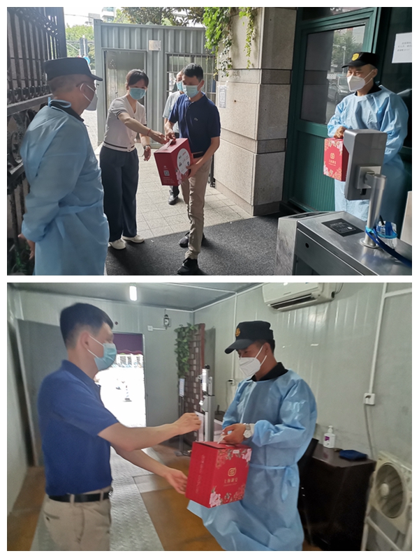 项延训一行首先来到位于徐汇校区南正门的保卫处,看望了守护校园安全的一线安全保卫人员,送去了防暑降温物品,叮嘱他们做好防暑降温和自我保护,并对他们始终坚守岗位,维护学校的安全、稳定、有序表示感谢。保卫处副处长童克峰简要介绍了疫情防控期间的校园安全保卫工作。