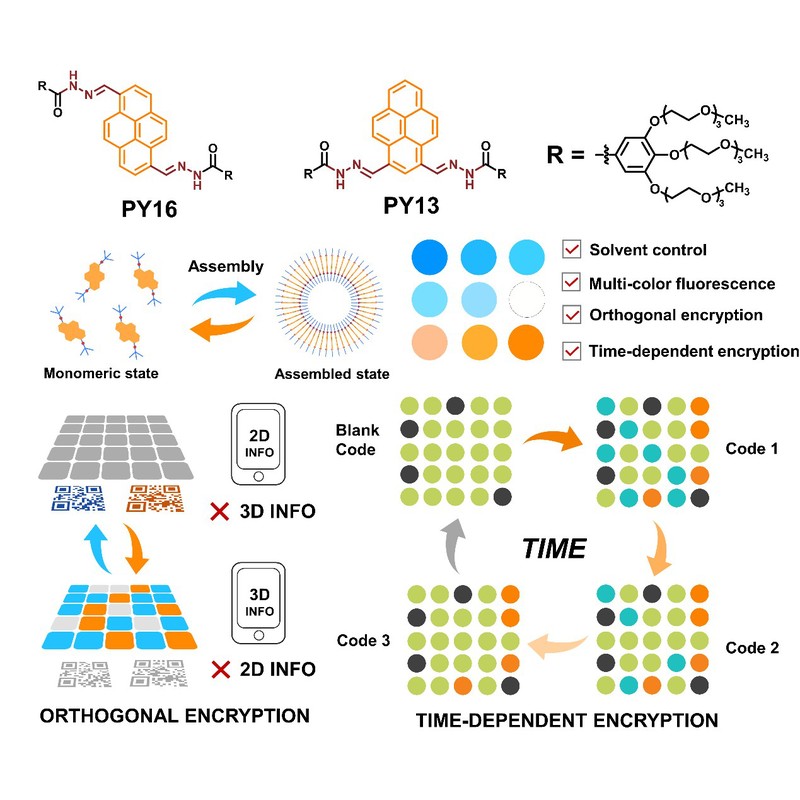本工作成功合成了具备两个酰腙取代基元的两亲性分子,该分子的发光性能与分子的组装行为密切相关。研究者们通过亲疏水作用力调控分子的动态组装行为,实现对其荧光颜色的可逆调控,在很大范围内能够调节其发光颜色从蓝到橙并包含白光。基于这一动态荧光体系,研究者们构建了三维码、荧光墨水等智能信息加密存储材料,并进一步采用蒸发调控荧光策略,成功构建出时间尺度上的信息存储加密材料,即荧光四维码(三维码+时间维度)。在该材料上编码的信息具有时效性,在不同的时间读取会产生不同的结果,正确的信息只在特定的时间能被读取出来,进而有效地提高了信息的安全。