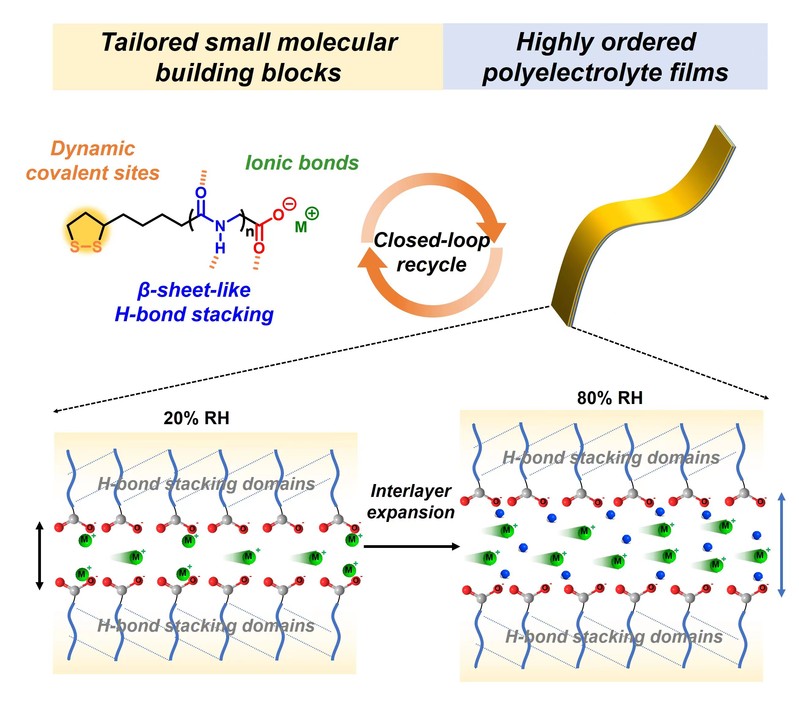 另一方面,将二硫化物介导的开环聚合与类β-折叠氢键自组装相结合,可以驱动小分子一步组装成构型精确可调和离子传输功能可控的有序性离子网络。该策略利用一步蒸发诱导自组装,指导离散小分子形成高结晶度的层状离子网络。通过改变寡肽侧链的长度,可以以纳米精度调控网络层间距。层状结构和末端亲水基团的协同作用促进了层间水通道的形成,使组装膜具有高效的离子传输性能。此外,得益于聚二硫网络的本征动态性,研究人员实现了在温和的条件下对单体进行化学回收。作为第一例具有闭环化学可循环性能的高性能聚电解质,这种简单而高效的分子工程策略将为导电聚合物、传感器和智能致动器的设计提供重要依据和思路指导。该成果以“Highly ordered supramolecular assembled networkstailored by bioinspired H-bonding confinement for recyclable ion-transportmaterials”为题,发表于CCS Chemistry。