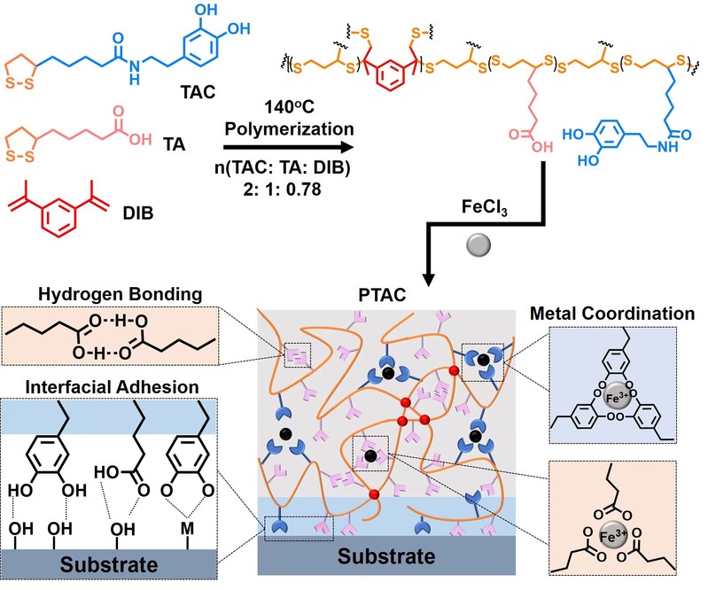 通过分子工程策略来创造坚固且防水的粘附材料,促进了对界面粘附机制的基本理解,有望进一步推动未来生物医学粘附材料的应用。对此,研究人员提出了一种简单有效的策略,将天然硫辛酸和贻贝激发的铁-邻苯二酚配合物相结合,制备了一种高强度(> 5 MPa)的水下粘附材料,同时在不同的表面上显示出显著的高粘附强度 (最高可达11.7 MPa)。实验结果表明,铁-邻苯二酚配合物的强交联作用以及高密度的氢键是导致超高界面粘接强度的原因,疏水性聚二硫化物网络的包埋效应进一步增强了防水性能。动态共价聚二硫网络赋予材料可重构特性,可通过反复加热和冷却实现重复使用。这种分子工程策略为动态超分子粘附材料的设计和构建提供了通用的解决方案。该成果以“Robust and dynamic underwater adhesives enabled bycatechol-functionalized poly(disulfides) network”为题,发表于Natl. Sci. Rev.。