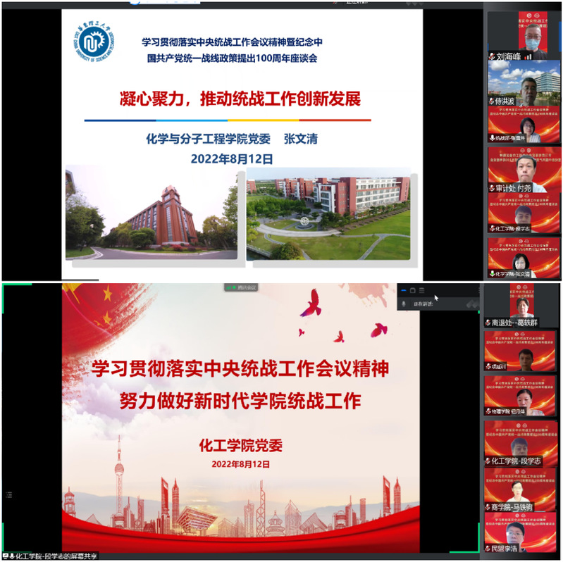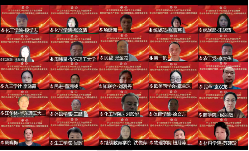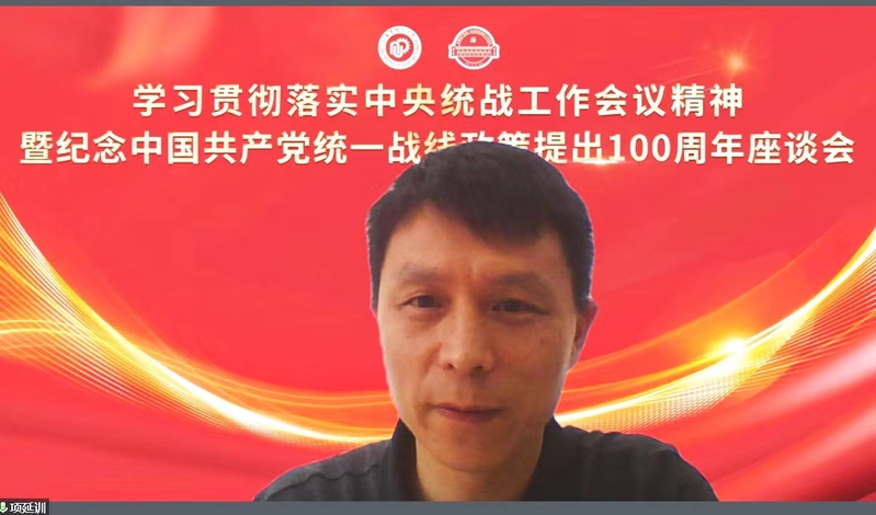 为了学习宣传和贯彻落实中央统战工作会议精神、传承百年统战历史经验,进一步做好新时代党的统一战线工作,8月12日上午,学校党委在线召开了学习贯彻落实中央统战工作会议精神暨纪念中国共产党统一战线政策提出100周年座谈会。校党委副书记项延训出席会议并讲话,各二级党组织书记、统战委员、统战工作联络员,党委统战部成员以及各民主党派、统战团体领导班子成员等100余名教师参会。会议由校党委统战部常务副部长张雪芹主持。