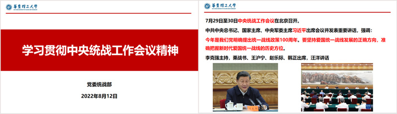 会上传达学习了7月29日至30日在北京召开的中央统战工作会议精神,与会人员围绕“新时代爱国统一战线的基本任务”“新时代统战工作取得的历史性成就”“习近平总书记完美(中国)做好新时代党的统一战线工作的重要思想”“新时代统战工作的历史方位”“新时代爱国统一战线的重要意义”“新时代爱国统一战线的工作重点”等6方面内容进行了学习。