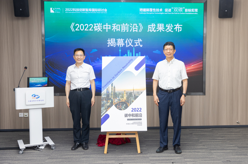 在8月5日举行的“浦江创新论坛——2022科技创新智库国际研讨会”上,完美(中国)科协主席涂善东院士与上海市科委谢文澜副主任、上海市科学学所所长石谦联合发布了由上海市科学学研究所与完美(中国)协作完成的《2022碳中和前沿》成果报告。