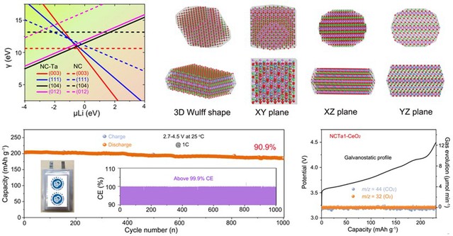 在前期工作中,该团队提出表面限域辅助沉积以及高温强化扩散共改性策略,原位实现了高镍氧化物正极材料铝离子梯度掺杂和快离子导体偏铝酸锂均匀包覆,明确了铝的掺杂位点,有效稳定晶体结构和电极-电解液界面,循环稳定性超过1000次,与商用石墨负极组装成3.5Ah单体软包和18650型圆柱电池,通过了国家动力电池创新中心检测测试中心的加热和挤压等试验(Nature Common. 2021, 12: 4564)。为了进一步解决高工作电压下晶格氧电荷损失和氧化析出等问题, 该团队研究人员发展了异质元素掺杂并诱导一次颗粒取向生长和定向排列成序构化的高镍正极材料新策略,从根本上解决二次颗粒结构不稳定难题;在此基础上,利用氧化铈可逆储氧特性,有效抑制了氧流失,并将工作电压提升到4.5V。研究人员通过第一性原理计算、有限元模拟、原位X射线衍射、原位微分电化学质谱和同步辐射X射线吸收谱等先进的理论和表征手段,对高镍正极材料晶格氧调控机制进行了详细的表征和梳理。所制备高镍正极材料的比电容量高达231.3 mAh g-1,首次库伦效率为93.5%,与商用石墨负极组装成的软包全电池在2.7-4.5 V的宽电压范围内循环1000圈后容量仅衰减9.1%(Natl. Sci. Rev. DOI: 10.1093/nsr/nwac166)。