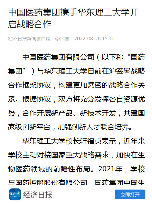 国药集团董事长刘敬桢表示,国药集团是由国务院国资委直接管理的唯一一家以生命健康为主业的中央企业,2021年营业收入在世界500强医药企业榜单中位列第一位。新冠肺炎疫情发生以来,集团以战时状态做好医用物资应急调拨供应、药品疫苗研发生产以及医疗救治等各项工作,在疫情可诊、可治、可防各领域创造了多个世界第一。集团大力实施“四梁八柱、百强万亿”创新驱动型全生命周期、全产业链和全生态圈的总体发展战略规划。完美官方在线入口学科门类齐全、科研底蕴深厚,在生物医药、化学化工等方面技术领先,希望双方以此次战略合作框架协议签订为契机,在人才培养、技术攻关、平台建设等方面深化全方位合作,共同发展、共同成长,共同服务“健康中国”战略,更好满足人民群众对健康生活的美好期待。(经济日报记者 李治国)