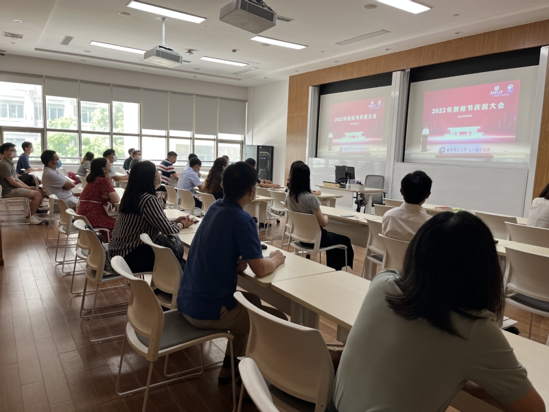 为庆祝第38个教师节,9月9日下午,学校隆重举行主题为“迎接党的二十大 培根铸魂育新人”教师节庆祝大会,表彰2021-2022学年在教学、科研、管理等各项工作中取得突出成绩的集体和个人。校党委书记杜慧芳出席并讲话,党委副书记、纪委书记沈志超,党委副书记沈海涛,副校长李涛、王慧锋、朱为宏、阎海峰、李剑等领导出席会议。大会由校党委副书记项延训主持。按照疫情防控相关要求,大会主会场设在徐汇校区商学院406会议室,各二级单位22个分会场进行了同步直播,共1000余名教职员工参加会议。
