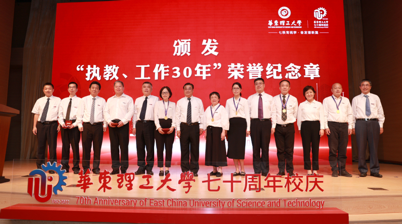 2022年,学校有29名在职教师在华理从事教育工作已满30年。三十年辛勤耕耘,他们不忘初心,扎根教育,为华理奉献自己的青春,与学校同发展共成长。会上,校领导为 “执教30年”“工作30年”教育工作者代表颁发纪念章,学生为他们献上鲜花。