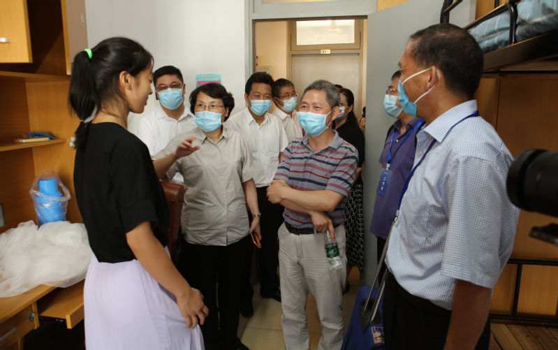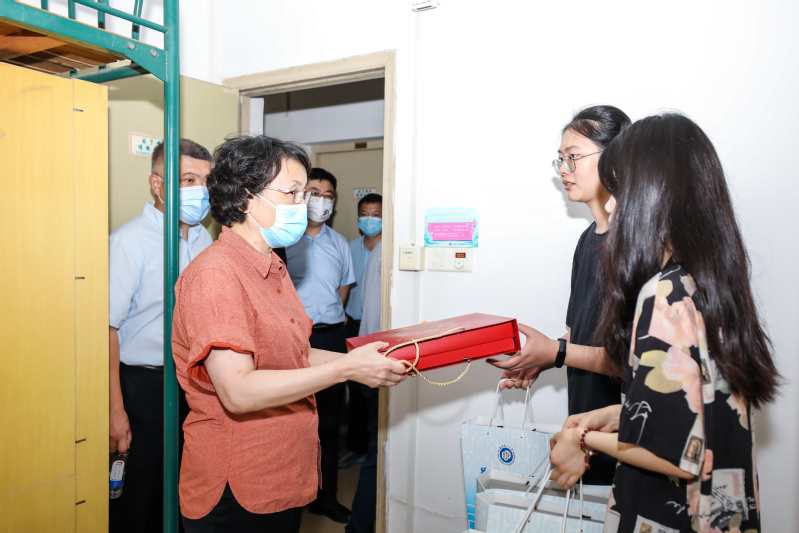 在深入了解各学院新生报到情况后,校领导来到第八教学楼检查核酸检测采样、行李存放、学生休息室以及后勤保障等情况,走访学生宿舍,看望研究生新生,与学生亲切交谈,并送上学校的慰问品,让研究生新生感受到学校大家庭的温暖。