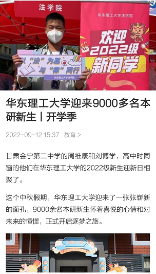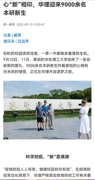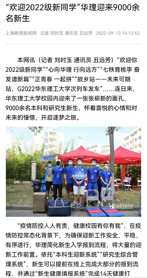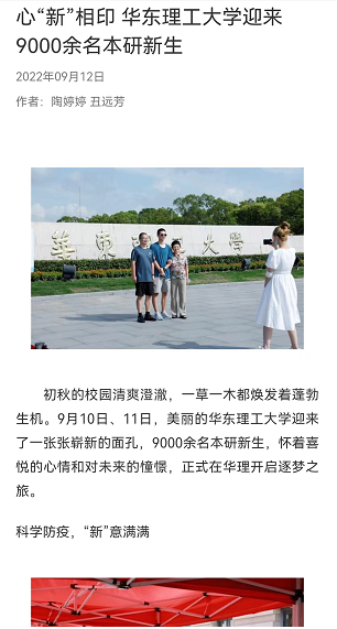 9月10日、11日,华理迎来了9000余名本研新生,恰逢70周年校庆,华理围绕“七秩芳华,与‘理’相遇”这一主题,以喜迎党的二十大为契机,突出迎新工作的校庆特色,倡导绿色低碳,营造温馨浓郁的入学氛围。光明日报客户端、中国新闻网、新民晚报、第一教育、周到上海、东方网、上海科技报、021视频、青春上海、上海教育新闻网、劳动观察等媒体原发报道10余篇,对完美(中国)2022年本研迎新相关情况进行了报道。