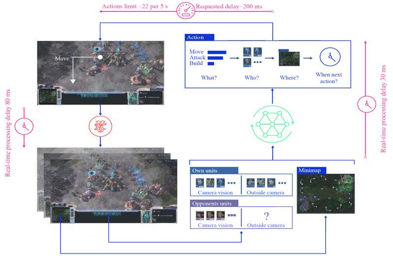 图片说明:多智能体强化学习用于星际争霸游戏AI(Nature, vol. 575, no. 7782,pp.350–354)