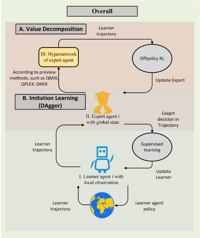 为了缓解累积误差带来的影响,研究团队提出了融合模仿学习的新型训练结构。与当前先进算法相对比,性能得到了显著的提升。具体而言,研究团队将训练过程分为值分解阶段和模仿学习阶段。在值分解阶段,算法根据历史策略轨迹,利用全局信息计算出改进的专家策略;在模仿学习阶段,算法根据专家策略,蒸馏得到在信息受限情况下学习者的策略。通过所提出的训练结构,将观测受限导致的误差分离到模仿学习阶段,从而避免在值分解训练过程中的误差累积。