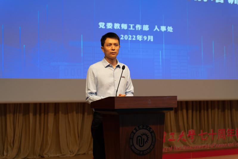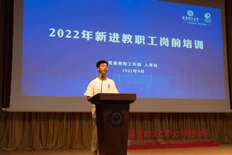 参训教师代表、化工学院雷林峰代表全体参训学员发言。他代表新进教职工向学校提供本次培训机会表示感谢,并分享了作为新时代青年教师,要如何在今后的工作中践行好“人民教师”这一身份的思考和感悟。一是不忘初心,坚持立德树人;二是心系华理,传承七秩荣光;三是勇攀高峰,潜心科研攻坚。最后,他代表全体参训学员表态,将严格遵守培训纪律,认真完成培训任务,将培训所学所思应用到教书育人实践中,在新时代展现出华理青年教师昂扬向上的风采。