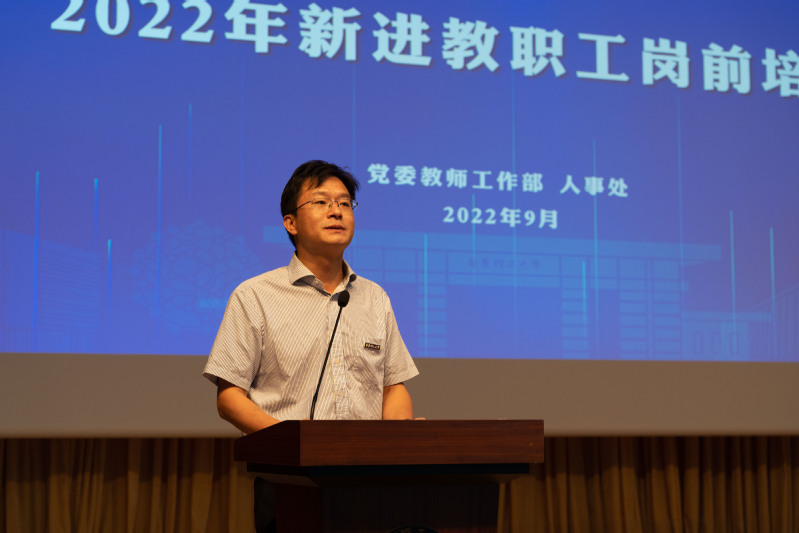 会上,项延训代表学校向新进教职工表示祝贺和欢迎,他指出,教育的发展,离不开教师的坚守和奉献,新进教职工要保持只争朝夕的精神状态、克难攻坚的勤奋姿态,在华理启航,成为教育事业的接续奋斗者。他以“立志培根铸魂 共谱华理新篇”为题,与新进教职工就岗前培训“为什么学”“要怎么学”“如何学以致用”提出三点期望。