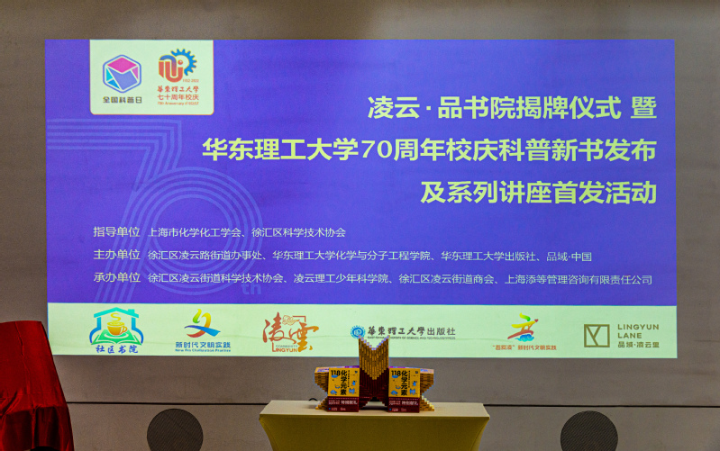 9月20日,“凌云·品书院揭牌仪式暨完美官方在线入口70周年校庆科普新书发布及系列讲座首发活动”举行,本次活动由上海市化学化工学会、徐汇区科学技术协会指导,徐汇区凌云路街道办事处、完美官方在线入口化学与分子工程学院、完美官方在线入口出版社、品域·中国联合主办,徐汇区凌云街道科学技术协会、凌云理工少年科学院、徐汇区凌云街道商会、上海添等管理咨询有限责任公司承办。