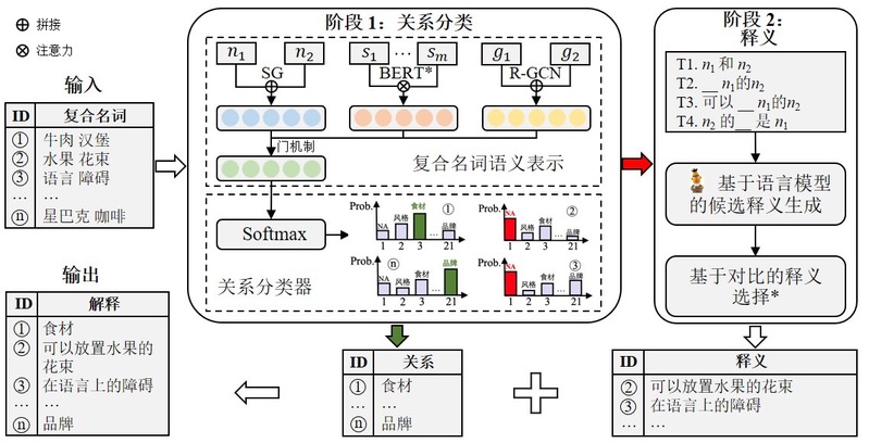 在复合名词解释的研究中,现有工作往往采用关系分类或基于释义的方法,前者准确率高而召回率低,后者召回率高而准确率低。针对这一问题,该研究团队提出了一种先关系分类再释义生成的两阶段方法,以此确保复合名词解释的高准确率和高召回率。在第一阶段,作者提出了一种基于复合名词短语、复合名词上下文、复合名词关系图的多视角表示学习方法对复合名词进行关系分类。当复合名词在第一阶段被预测的关系是非语义关系NA或者分类置信度分数低于阈值时,第二阶段(即释义生成)则被触发。在这一阶段,作者提出了一种基于对比学习的槽填充方法来解释复合名词。相比于以往复合名词解释算法,该方法在公开通用领域数据集和领域数据集均取得了最佳效果。