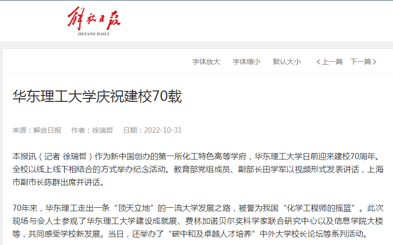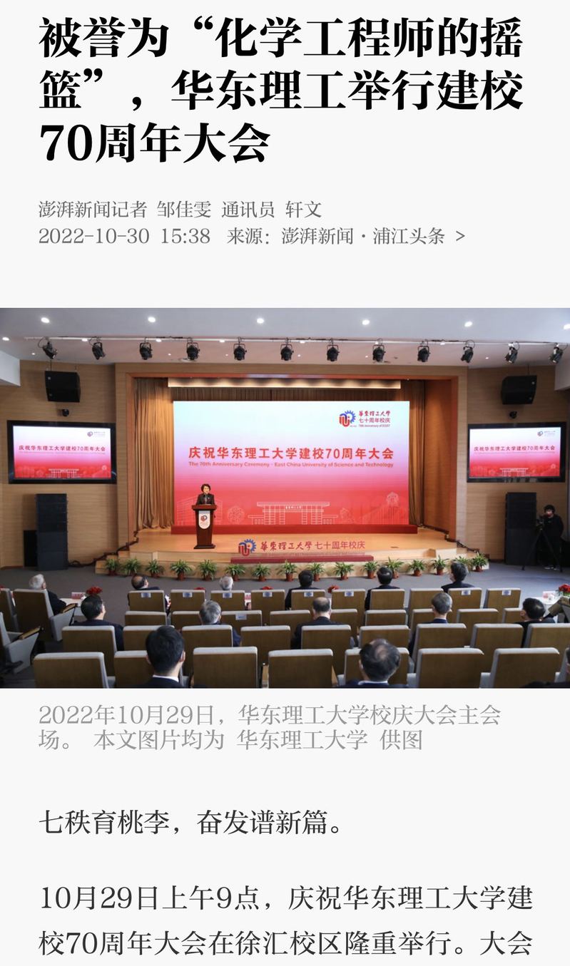 【澎湃新闻】被誉为“化学工程师的摇篮”,华东理工举行建校70周年大会