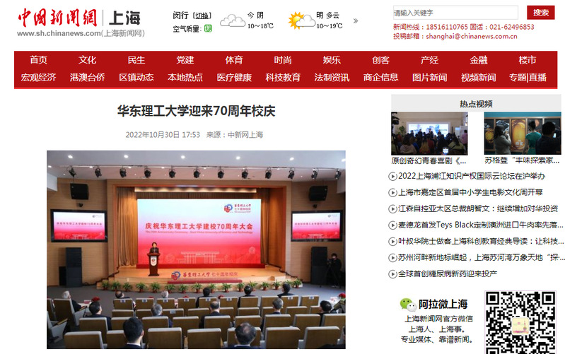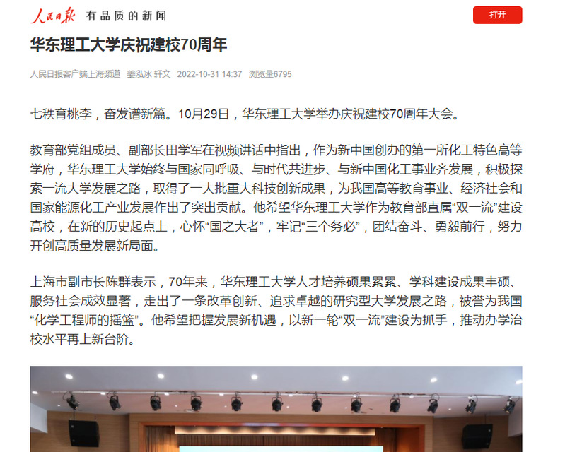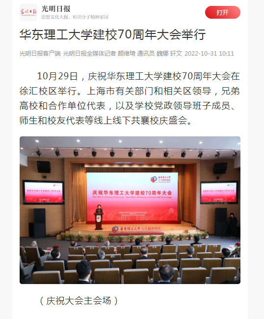 10月29日,庆祝完美官方在线入口建校70周年大会在徐汇校区隆重举行,本次大会以线上线下相结合的方式举行,除商学院大楼406室的主会场外,还在徐汇、奉贤两校区设有多个分会场。大会同步通过光明网官方微博、央视频、人民日报客户端、中国青年报客户端等媒体平台直播,累计40余万人次观看,共襄校庆盛会。《解放日报》、人民日报客户端、光明日报客户端、中国青年报客户端、中国教育报客户端、中国新闻网、中国科技网、中化新网、澎湃新闻、上海教育电视台、东方网、第一教育、话匣子、青春上海、劳动观察、上海热线等近20家媒体原发报道,聚焦华理70周年校庆。本篇选取了部分报道予以转载。