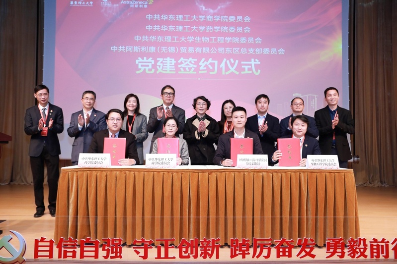 随后,阿斯利康(无锡)贸易有限公司东区党总支书记、飞鹰业务部执行总监言华国,商学院党委书记侯丽敏,药学院党委书记倪炜,生物工程学院党委书记吴辉,共同签署了党建共建协议书,就依托党建工作进一步深化产教研融合达成共识。